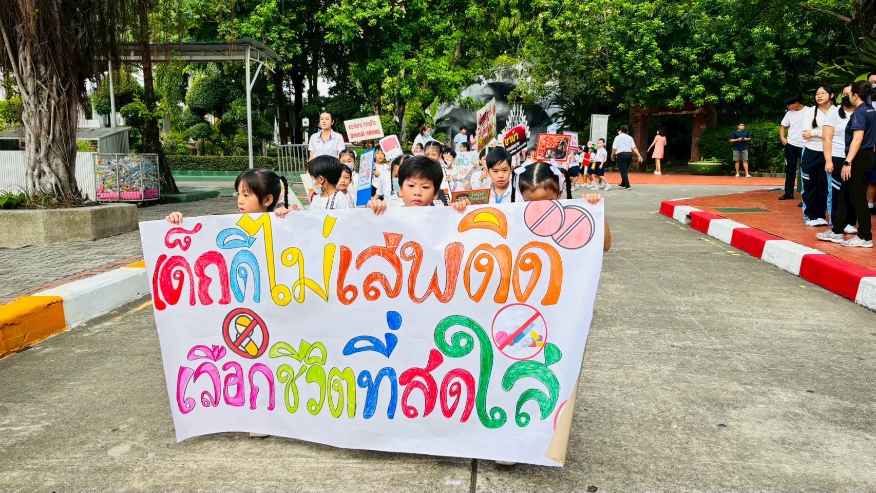 เด็กๆ ได้ร่วมเดินขบวนพร้อมถือป้ายให้ความรู้ เกี่ยวกับการป้องกันยาเสพติด และรณรงค์การใช้เวลาว่างให้เป็นประโยชน์