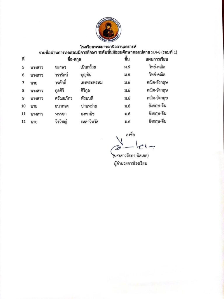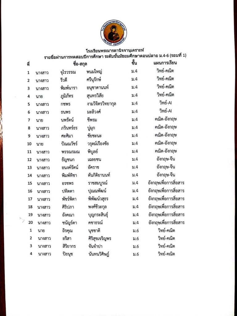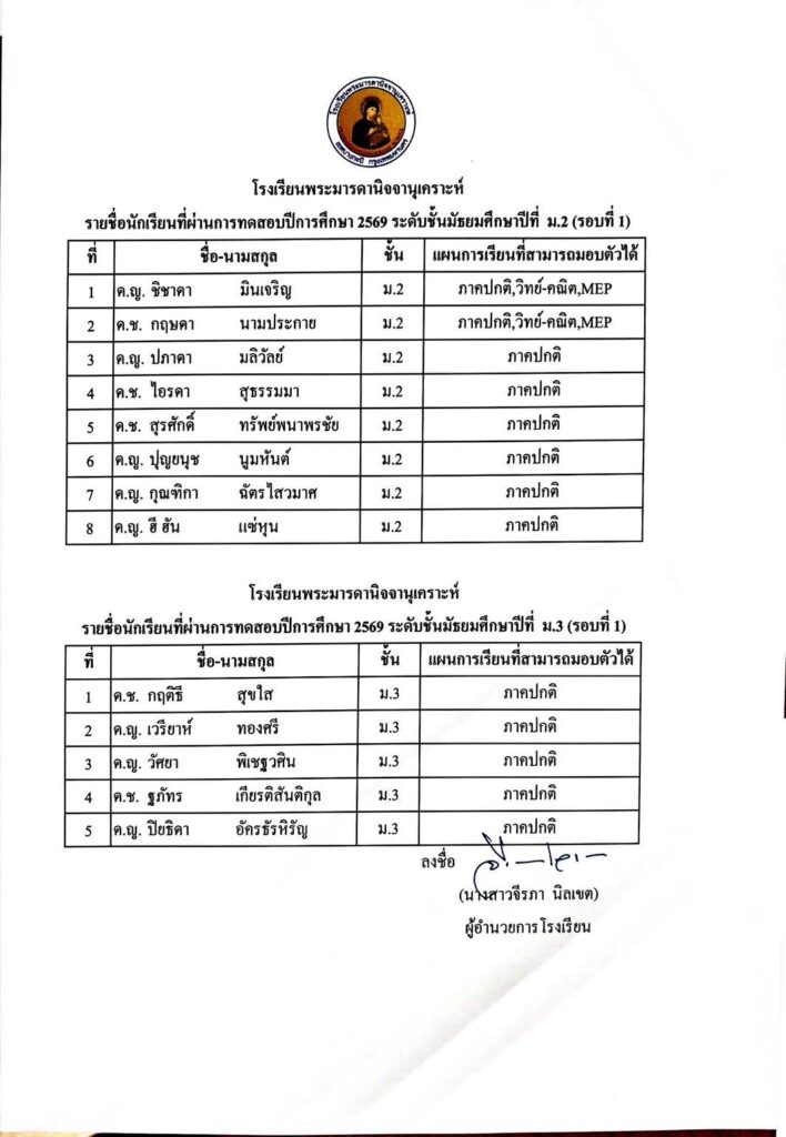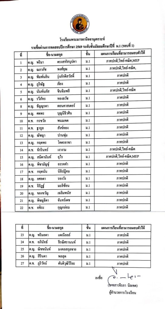 รายชื่อนักเรียนผ่านการทดสอบปีการศึกษา 2569